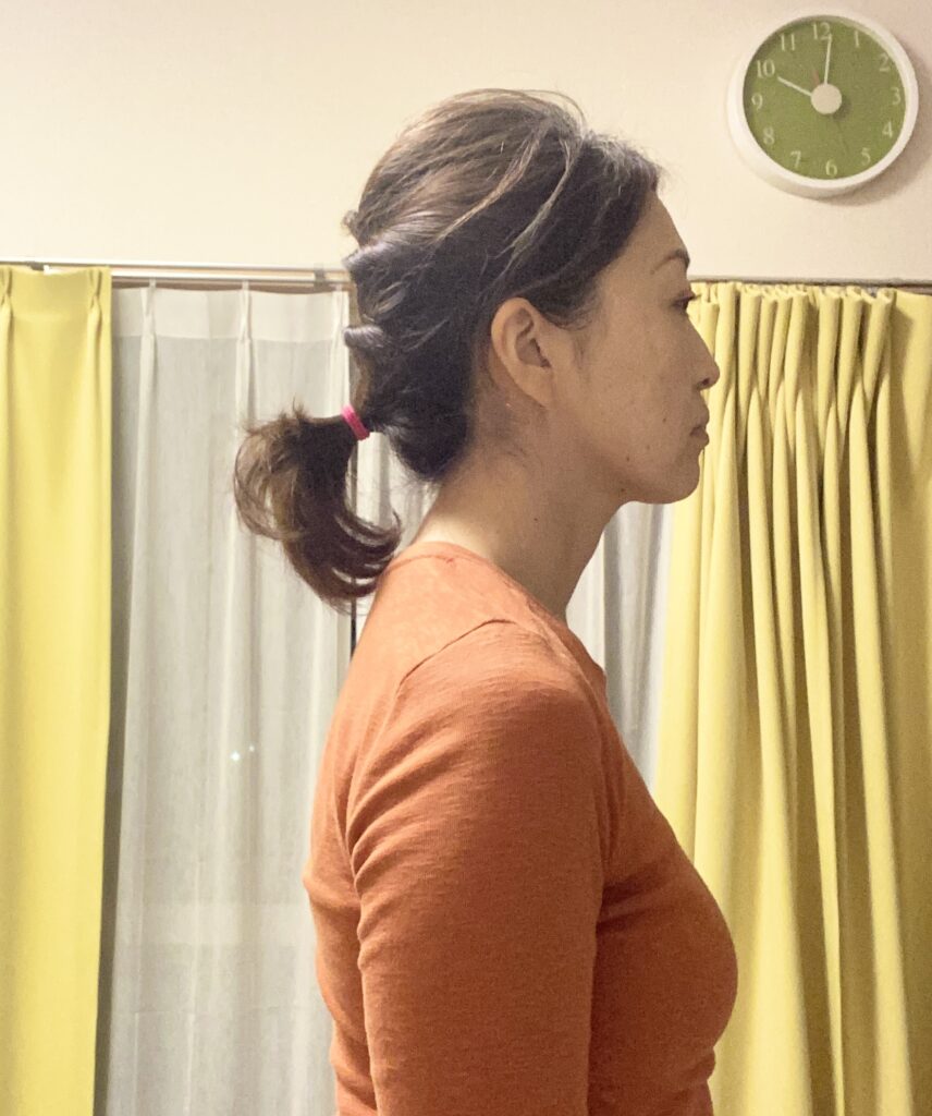 背中の上部が丸まり、首が前に倒れて、頭も前側に移動していますね💦